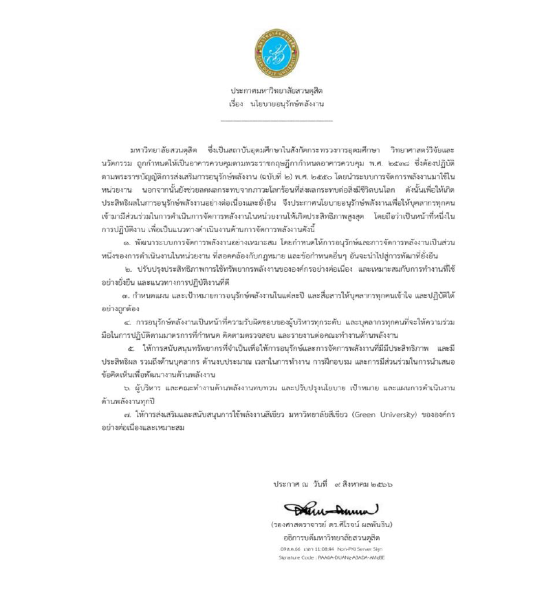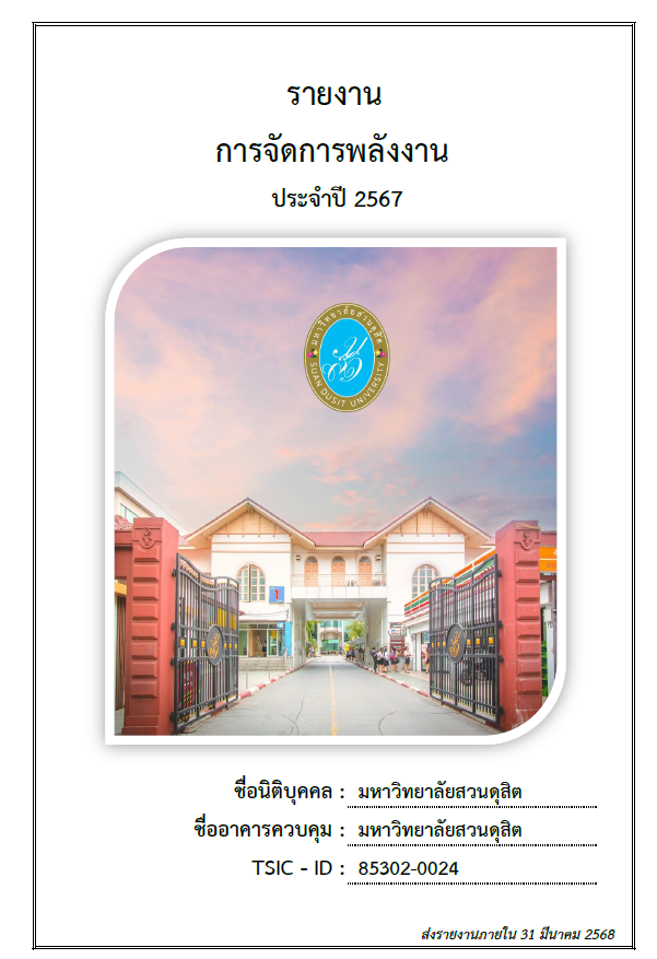 Suan Dusit University demonstrates a strong commitment to sustainable energy management. The university not only complies with legal requirements but also serves as a key contributor in reporting, improving, and formulating clean energy policies and energy-efficient technology frameworks.