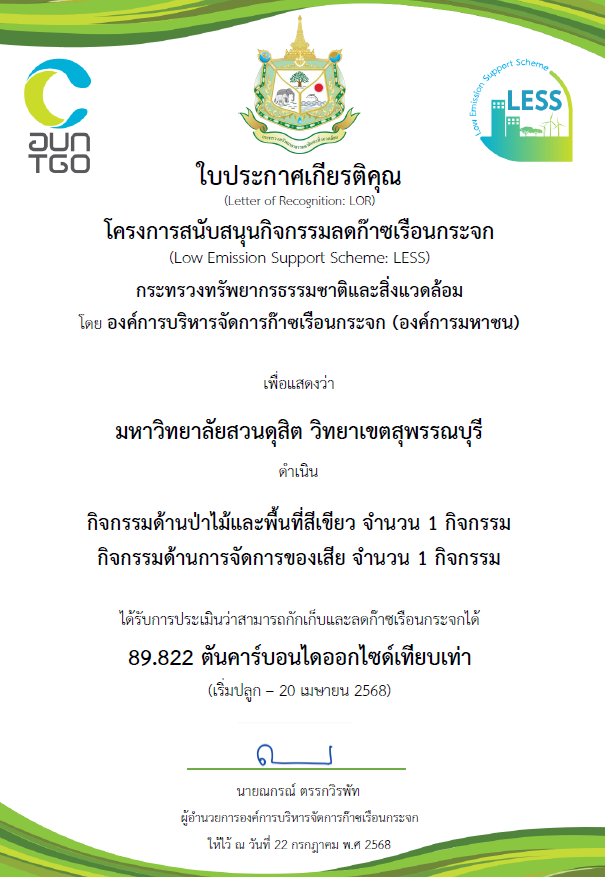 The “Greenhouse Gas Mitigation Mechanism Development Project within Suan Dusit University (Fiscal Year 2024)” represents far more than an effort to merely reduce greenhouse gas emission figures it embodies the creation of an environmentally conscious organizational culture. This initiative reinforces Suan Dusit University’s readiness to advance toward becoming an environmentally friendly institution and a model low-carbon society in the near future. It reflects the university’s deep commitment to embedding sustainability into its identity, operations, and community impact ensuring that environmental responsibility becomes a defining part of its institutional culture.