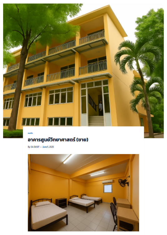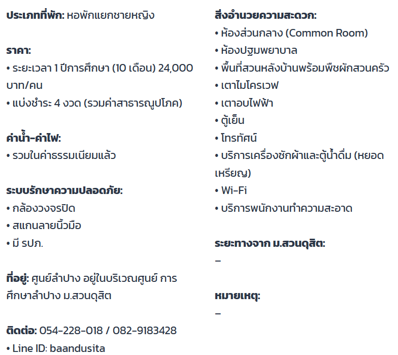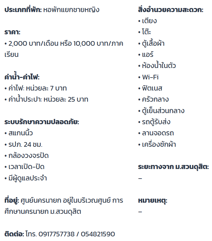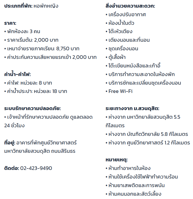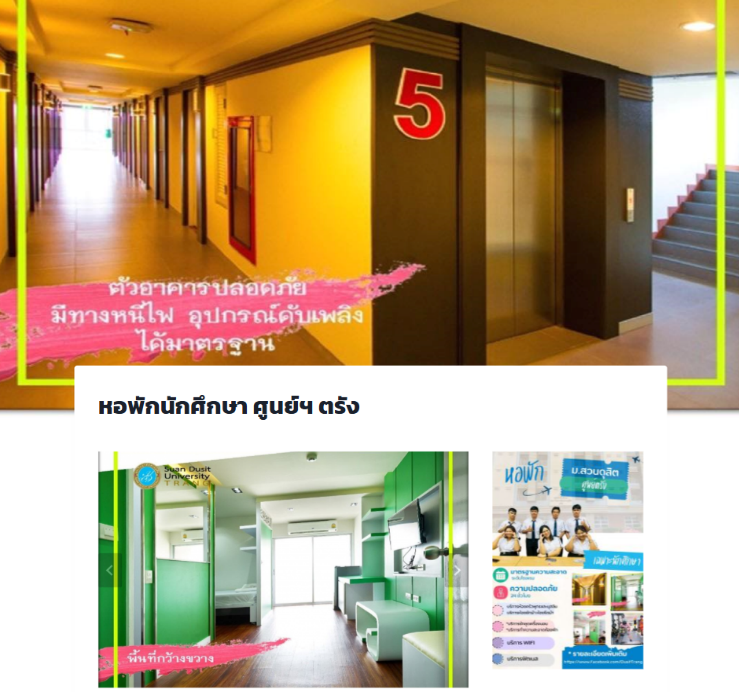 AI-generated content may be incorrect. มหาวิทยาลัยสวนดุสิตยังได้จัดสรรหอพักในหลายพื้นที่ ทั้งในเขตดุสิตซึ่งเป็นวิทยาเขตหลัก ตลอดจนในวิทยาเขตและศูนย์การศึกษาต่าง ๆ โดยทุกพื้นที่บริหารจัดการภายใต้นโยบาย “Green & Clean Campus” ที่ให้ความสำคัญต่อสุขภาวะของผู้อยู่อาศัย การใช้พลังงานและทรัพยากรอย่างมีประสิทธิภาพ และการสร้างวัฒนธรรมการอยู่ร่วมกันอย่างเคารพ รับผิดชอบ และเอื้ออาทรต่อส่วนรวม ซึ่งเป็นเอกลักษณ์ของความเป็น “สวนดุสิต” https://studentaffairs.dusit.ac.th/test-01 https://tcas.dusit.ac.th/dormitory/