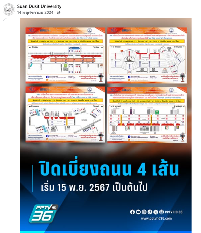 มหาวิทยาลัยสวนดุสิต ตั้งอยู่ในเขตดุสิต ซึ่งเป็นพื้นที่ศูนย์กลางของการคมนาคม จึงให้ความสำคัญกับการสื่อสารข่าวสารเกี่ยวกับการปิดถนนหรือการก่อสร้างระบบรางในพื้นที่ใกล้เคียง ตลอดจนช่วงที่มีการจัดงานสำคัญ เพื่อให้บุคลากรและนักศึกษาสามารถวางแผนการเดินทางได้อย่างเหมาะสม ส่งเสริมให้เลือกใช้ระบบขนส่งสาธารณะมากขึ้น และลดความแออัดของการจราจรในย่านวัฒนธรรมที่มีความหนาแน่นสูง