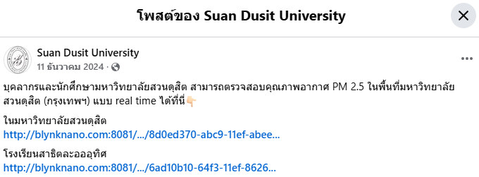 มหาวิทยาลัยสวนดุสิตตระหนักถึงความสำคัญของคุณภาพอากาศในพื้นที่การเรียนรู้และการเดินทาง จึงได้ติดตั้ง ระบบตรวจวัดฝุ่นละอองขนาดเล็ก PM2.5 แบบ Realtime ภายในพื้นที่หลัก ได้แก่