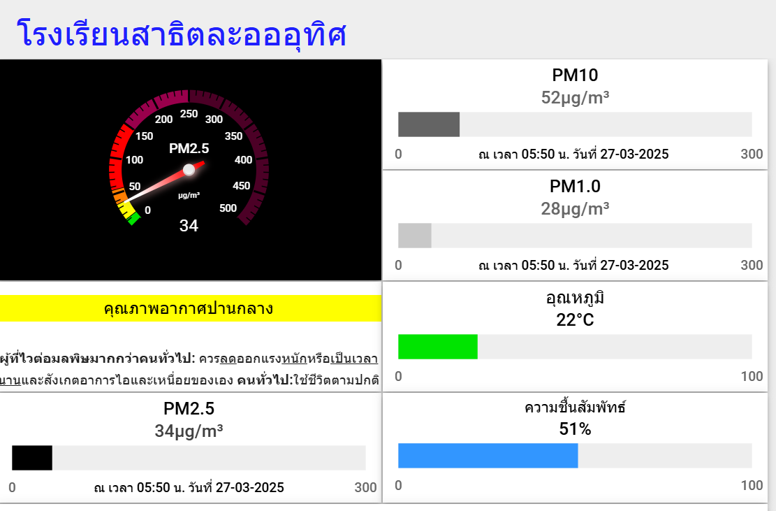 AI-generated content may be incorrect. ระบบดังกล่าวแสดงค่าฝุ่นและคุณภาพอากาศผ่านจอแสดงผลในพื้นที่และช่องทางออนไลน์ เพื่อให้บุคลากร นักศึกษา และประชาชนสามารถตรวจสอบสถานการณ์ได้แบบเรียลไทม์ ช่วยให้ทุกคนสามารถ วางแผนการเดินทาง ได้อย่างเหมาะสม เช่น การเลือกเดินหรือปั่นจักรยานในวันที่อากาศดี หรือหลีกเลี่ยงการเดินทางกลางแจ้งเมื่อค่าฝุ่นสูง นอกจากนี้ มหาวิทยาลัยยังได้จัดทำ สื่อประชาสัมพันธ์ในรูปแบบอินโฟกราฟิกและป้ายเตือนในพื้นที่ เพื่อให้ข้อมูลแก่ผู้สัญจรอย่างเข้าใจง่ายและต่อเนื่อง แนวทางนี้จึงไม่เพียงเป็นส่วนหนึ่งของการจัดการสิ่งแวดล้อมเท่านั้น แต่ยังเป็นเครื่องมือสำคัญที่ช่วย ส่งเสริมพฤติกรรมการเดินทางที่ยั่งยืนและตระหนักถึงผลกระทบของมลพิษทางอากาศ ในชีวิตประจำวัน